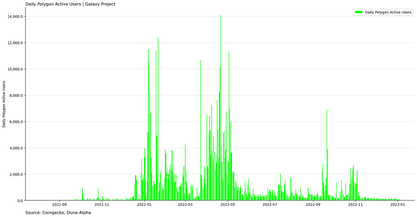 Galaxy has not seen much activity on its platform recently, with daily users on Polygon numbering only 100-400. Other metrics show similar low levels of user activity.