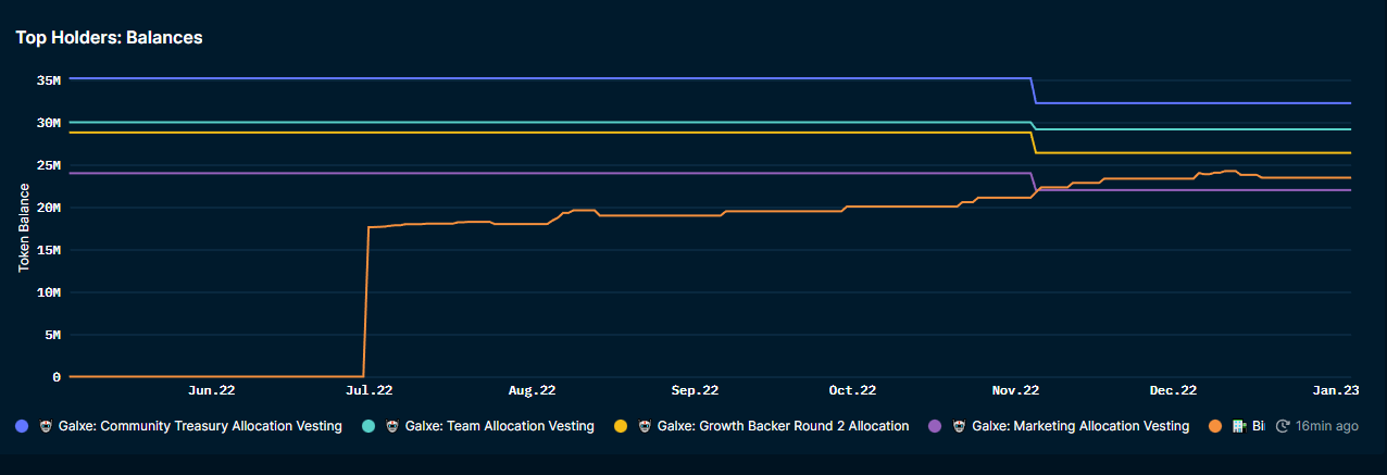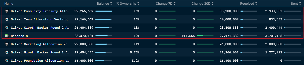 The top holders of the Gal token are currently the Galaxy Treasury wallet, holding 16% of the supply, and the Team Allocation Vesting wallet, holding 15% of the supply. These two wallets are followed by the Growth Backer Investor from Round 1 wallet, which holds 9% of the supply, the Growth Backer Investor from Round 2 holds 13% of the supply. the Marketing Allocation wallet, which holds 11%. And the Galaxy foundation wallet holds 8.2% of the supply,