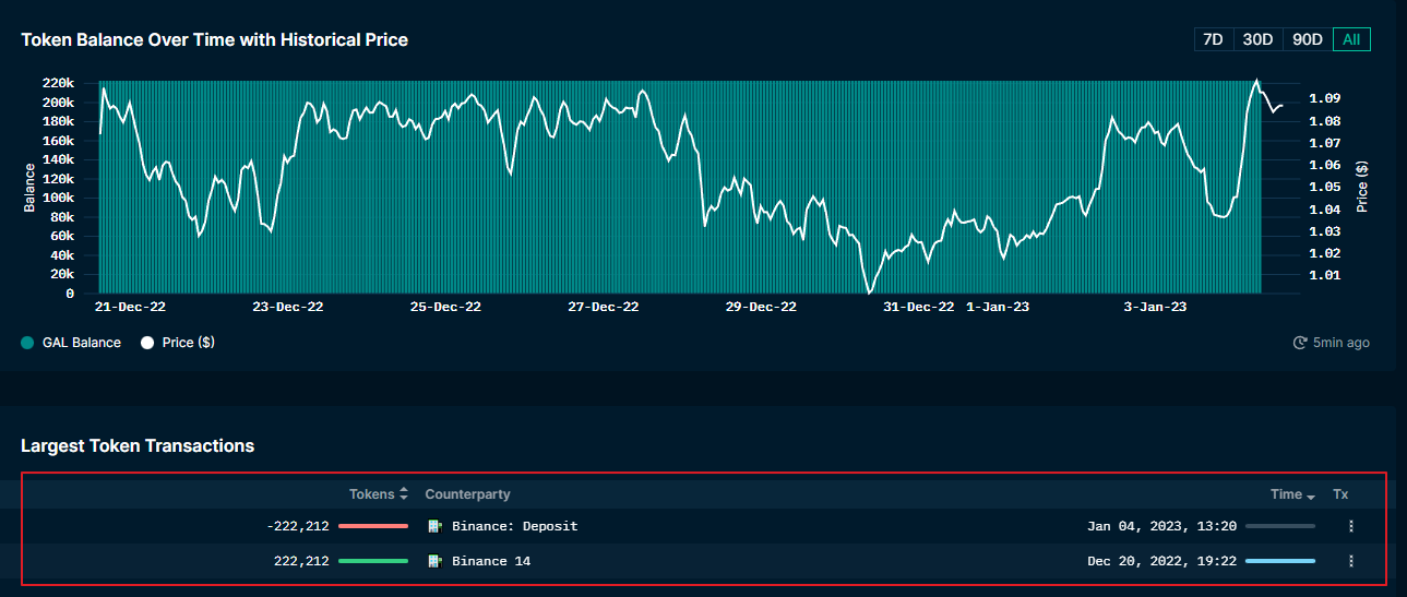 The second wallet that made large deposits of GAL tokens to Binance has been holding these tokens since May 2022. The wallet made the deposits between January 1st and January 4th of this month.