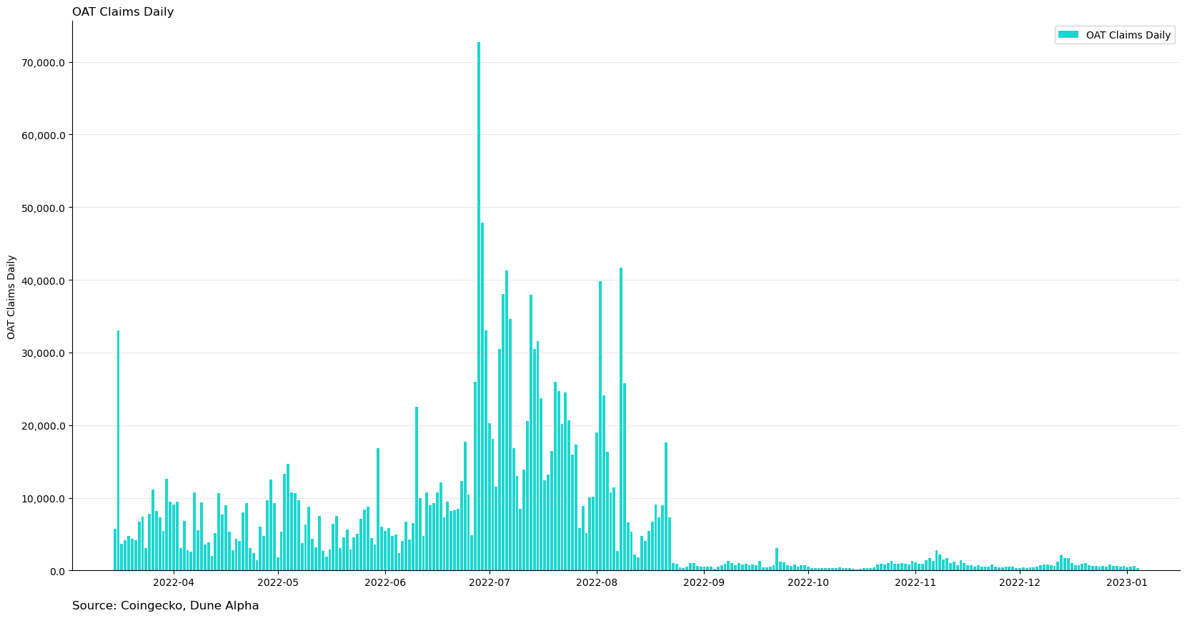 Galxe OAT is for creating and distributing digital badges, known as NFTs, to people who participate in events or activities. Event organizers can create events and badges on the Galxe website and participants can claim their badges by email. Recently, the number of OAT Claims has been low, ranging from 300-600 per day, indicating a decrease in demand and usage of the platform compared to July 2022. (as shown in Graph below)