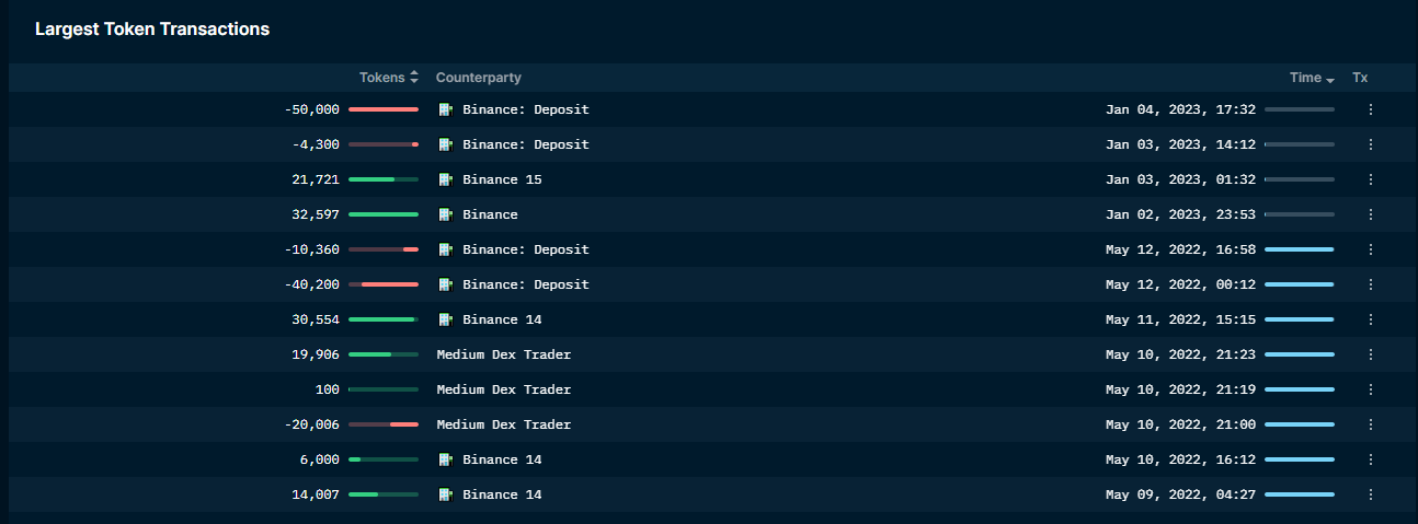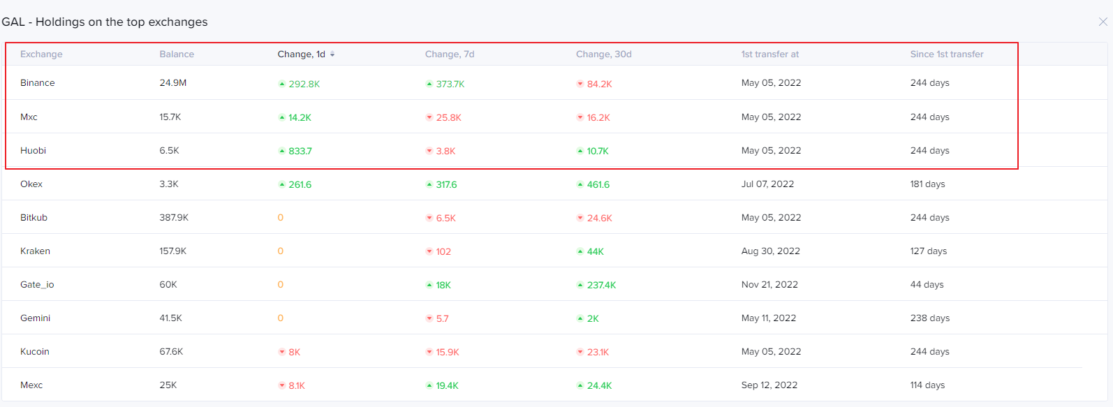 The largest exchange for GAL deposits over the past 7 days has been Binance, which saw a total of 374,176 GAL tokens deposited. A closer look at the data reveals that two high balance wallets were responsible for the majority of these deposits. One wallet deposited 50,000 GAL tokens to Binance, while another deposited 222,212 GAL tokens. It is unclear at this time what the motivations behind these large deposits may be, but they could potentially indicate a shift in market sentiment or a change in the strategies of major holders.