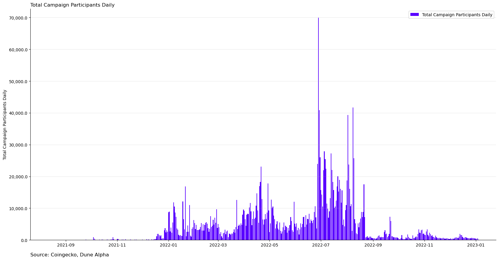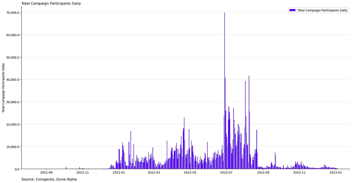 Currently, the number of daily campaign participations is ranging between 300-900, which is significantly lower than the all-time high of 50,000 daily campaigns on July 2022. It appears that the number of daily campaign participations has decreased since the all-time high. Shows lack of interest from New participants.